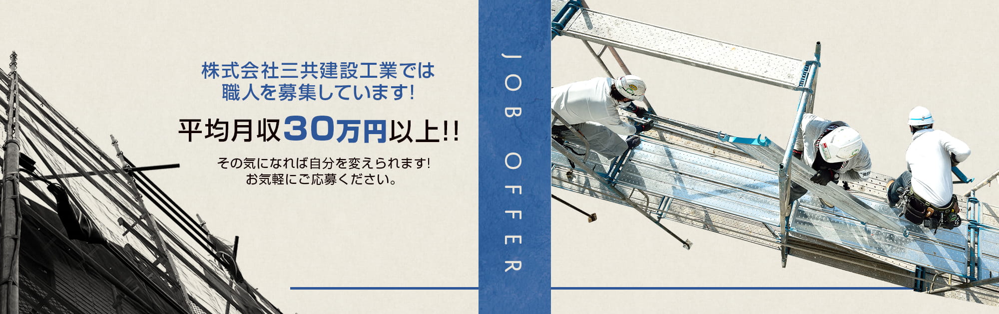 株式会社三共建設工業では一緒に働ける職人並びに、協力会社様を募集しております。株式会社三共建設工業の考えをご理解頂き、共に成長できるパートナーシップとして歩んで行けたらと思います。